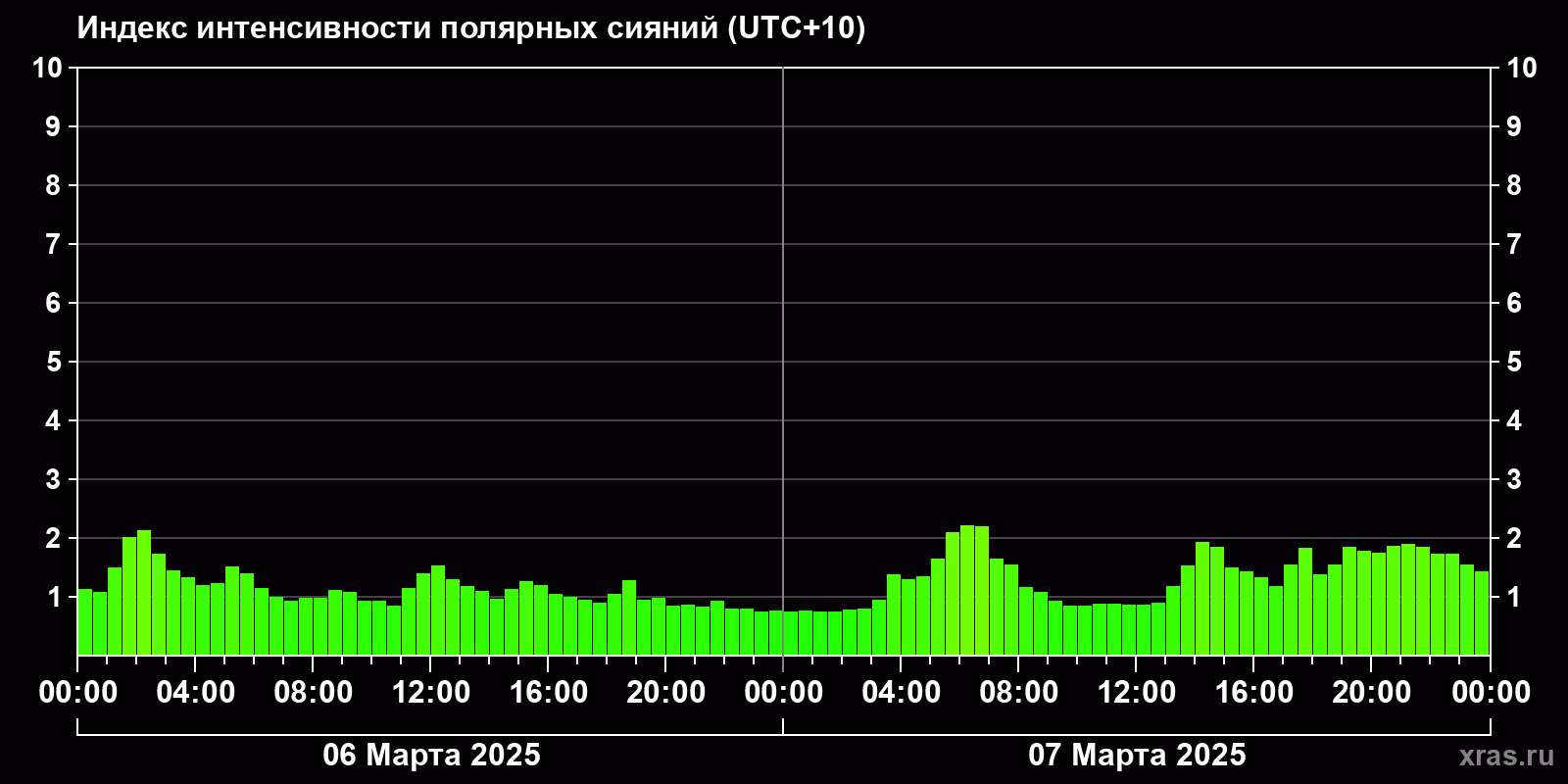 Изменения индекса интенсивности полярных сияний с 2025-03-06 по 2025-03-07 по местному времени