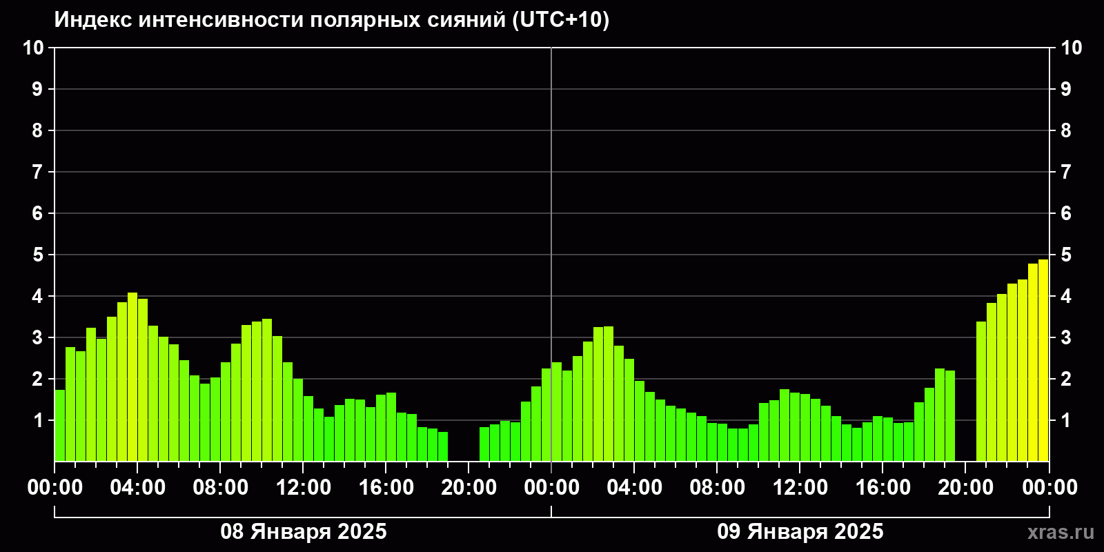 Изменения индекса интенсивности полярных сияний с 2025-01-08 по 2025-01-09 по местному времени