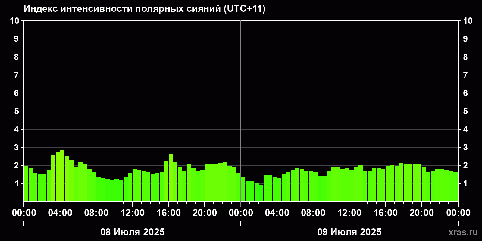 Изменения индекса интенсивности полярных сияний с 2025-07-08 по 2025-07-09 по местному времени