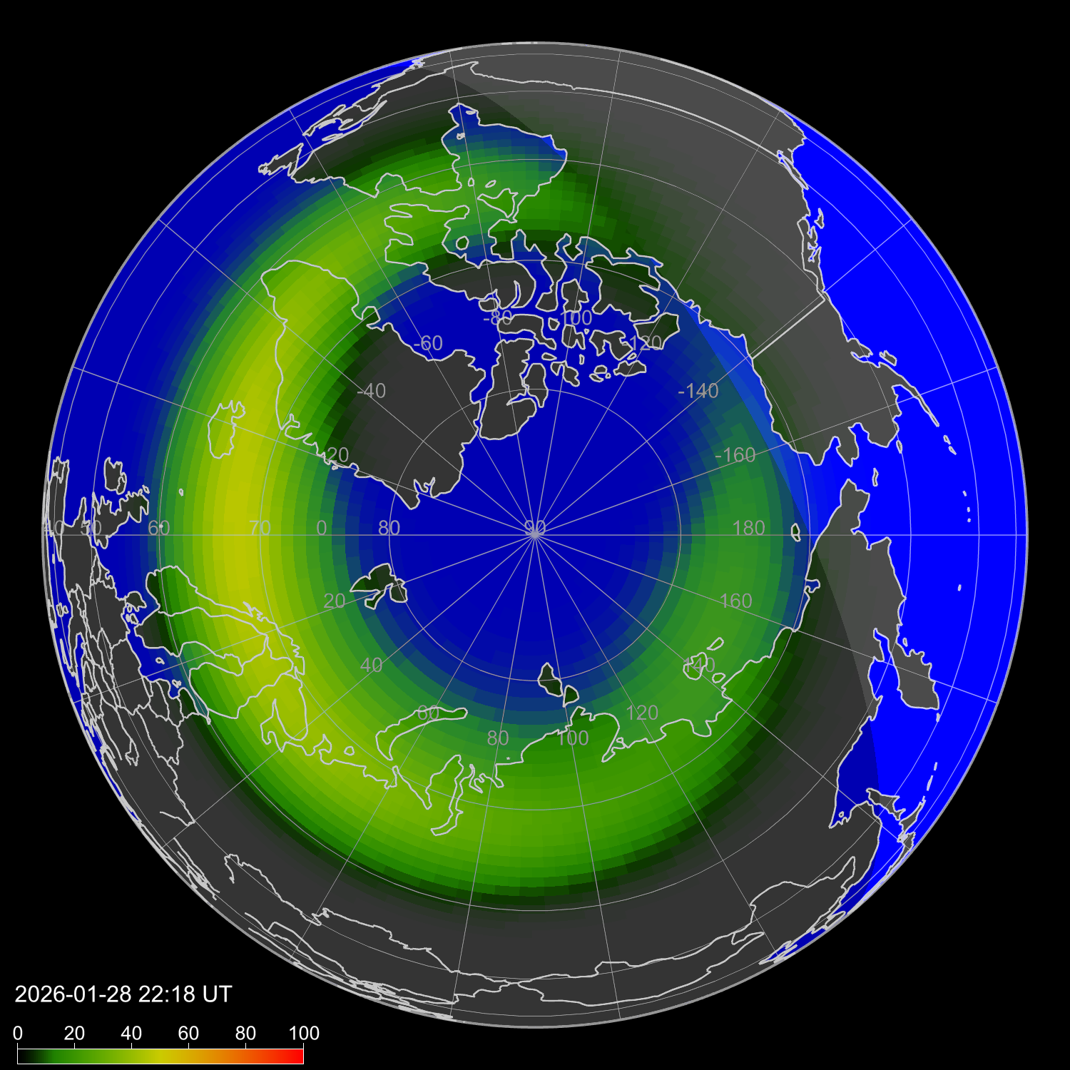 Изменения и часовой прогноз индекса интенсивности полярных сияний с 2026-01-28 по 2026-01-29