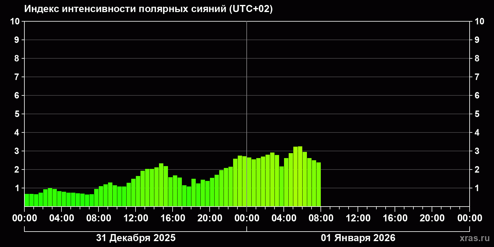 Изменения индекса интенсивности полярных сияний с 2025-12-31 по 2026-01-01 по местному времени