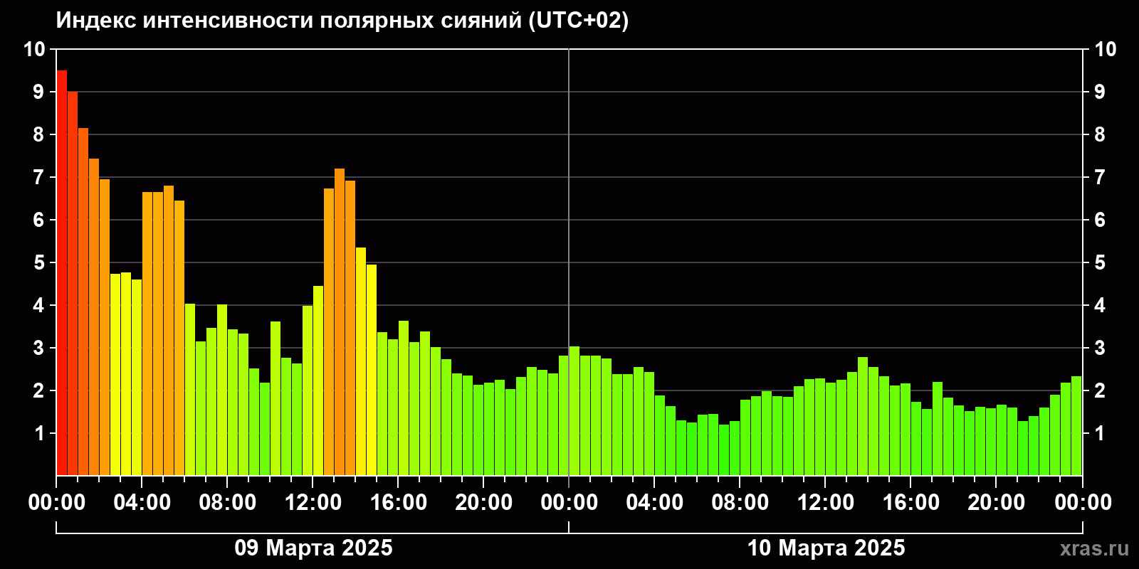 Изменения индекса интенсивности полярных сияний с 2025-03-09 по 2025-03-10 по местному времени