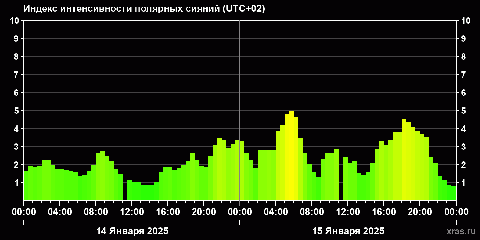 Изменения индекса интенсивности полярных сияний с 2025-01-14 по 2025-01-15 по местному времени