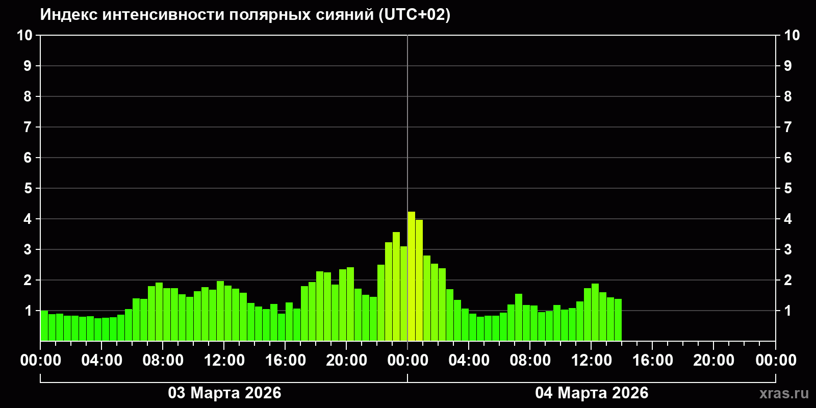 Изменения индекса интенсивности полярных сияний с 2026-03-03 по 2026-03-04 по местному времени