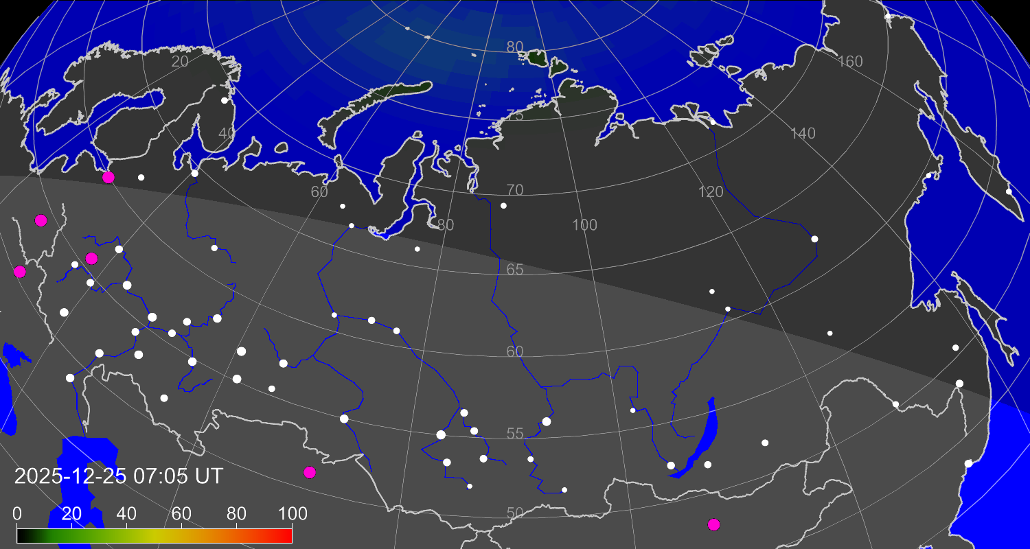 Индекс интенсивности полярных сияний и теоретически возможная широта наблюдений для ночного времени в восточном полушарии