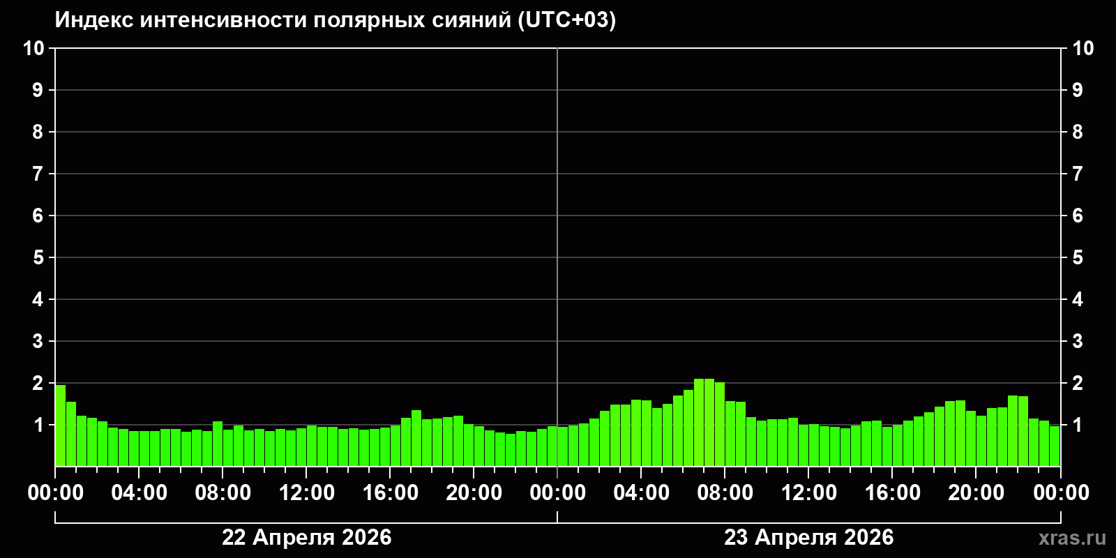 Изменения индекса интенсивности полярных сияний с 2026-04-22 по 2026-04-23 по местному времени