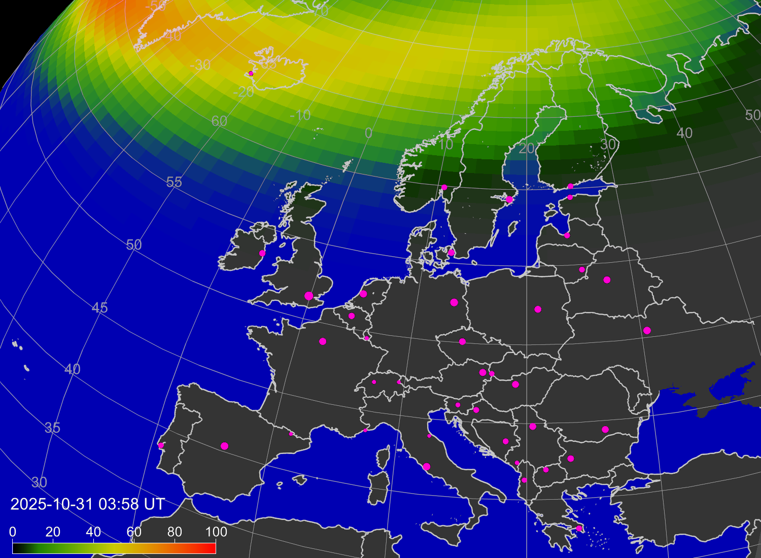 Изменения и часовой прогноз индекса интенсивности полярных сияний с 2025-10-30 по 2025-10-31