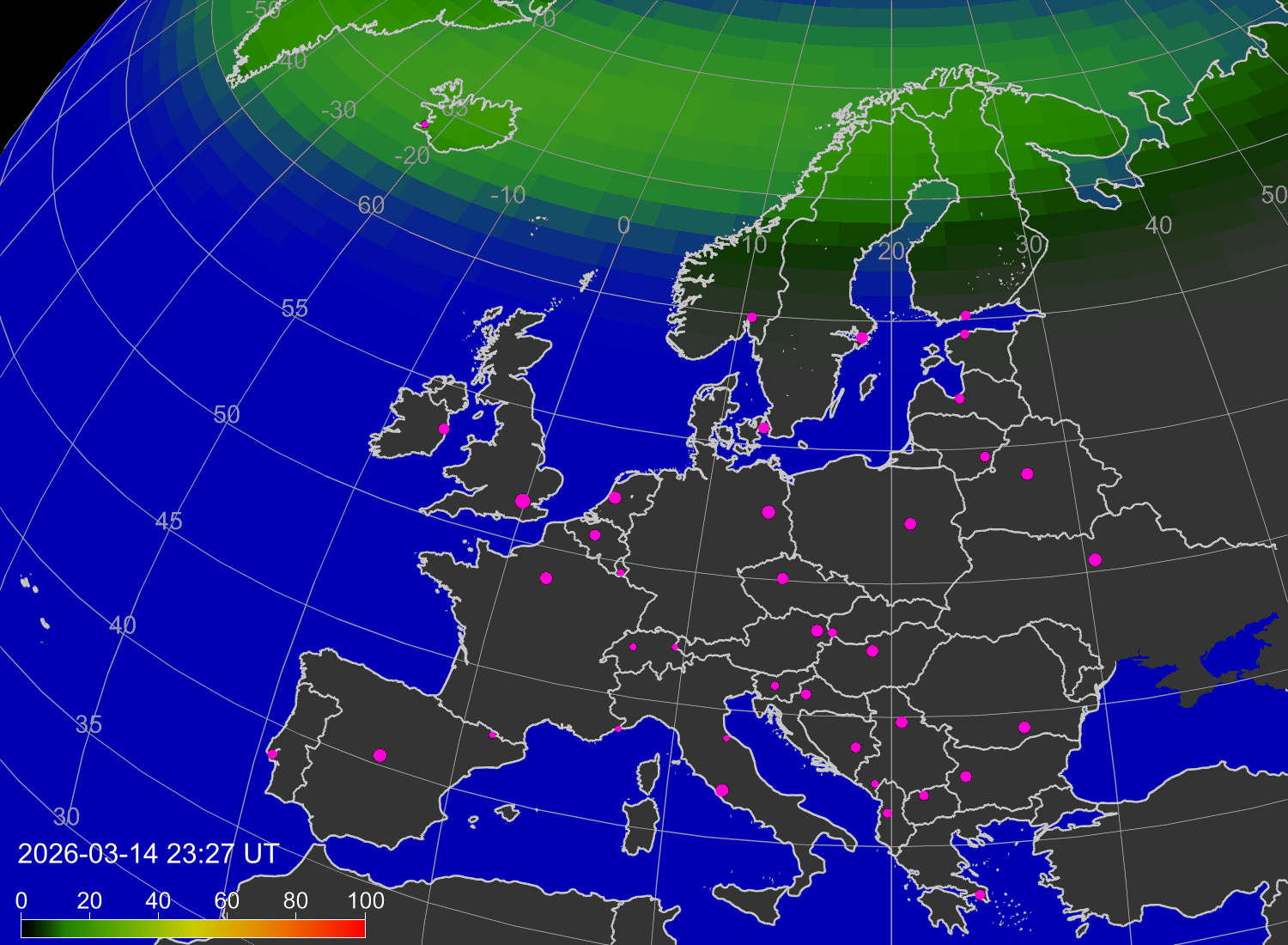 Вероятность полярных сияний в городах Европы