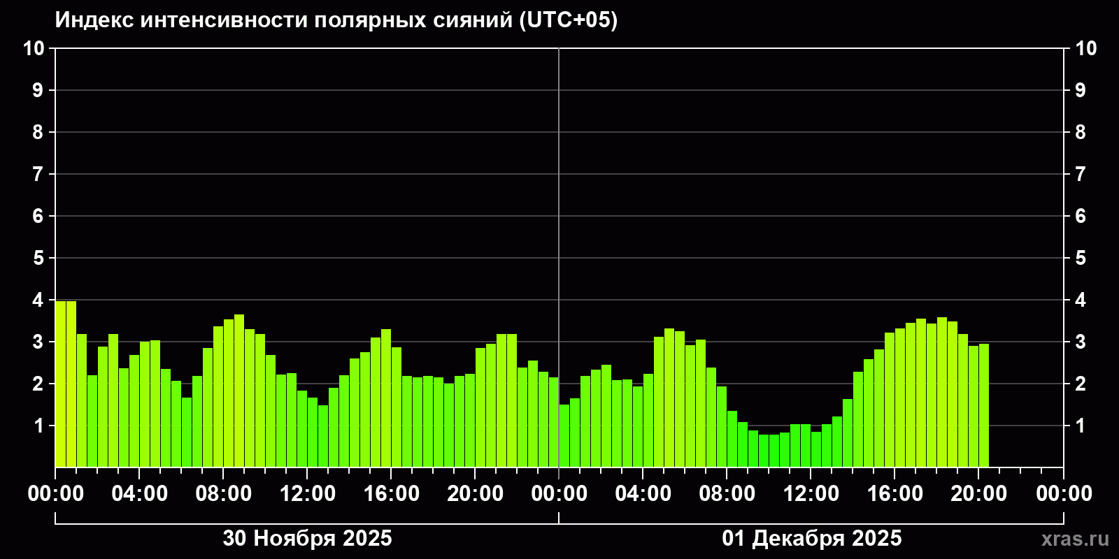 Изменения индекса интенсивности полярных сияний с 2025-11-30 по 2025-12-01 по местному времени