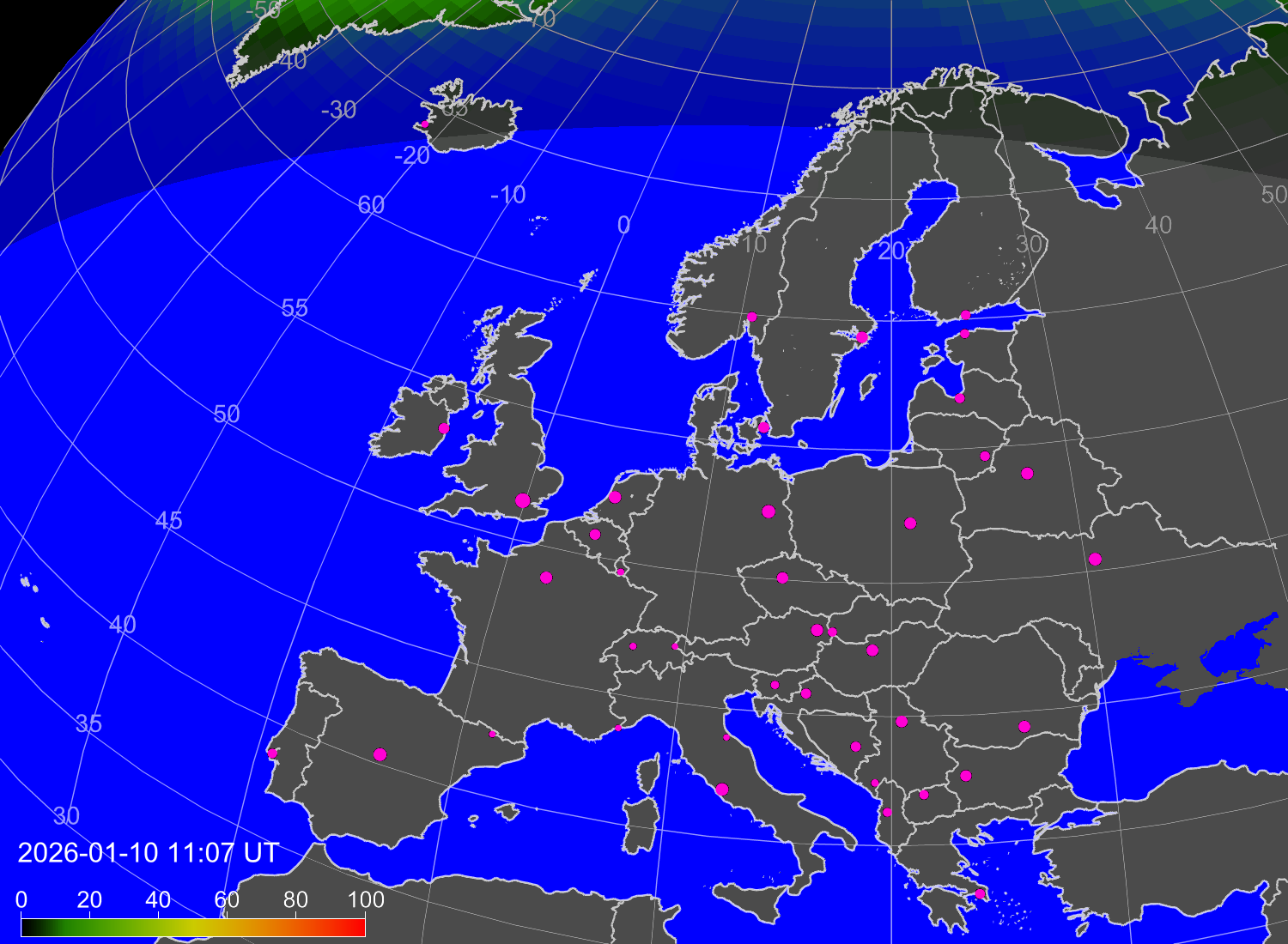 Индекс интенсивности полярных сияний и теоретически возможная широта наблюдений для ночного времени в восточном полушарии