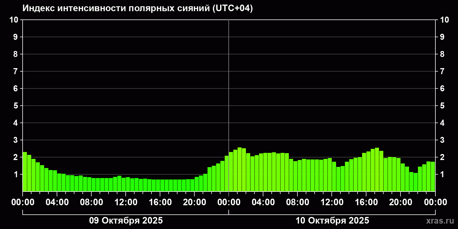 Изменения индекса интенсивности полярных сияний с 2025-10-09 по 2025-10-10 по местному времени