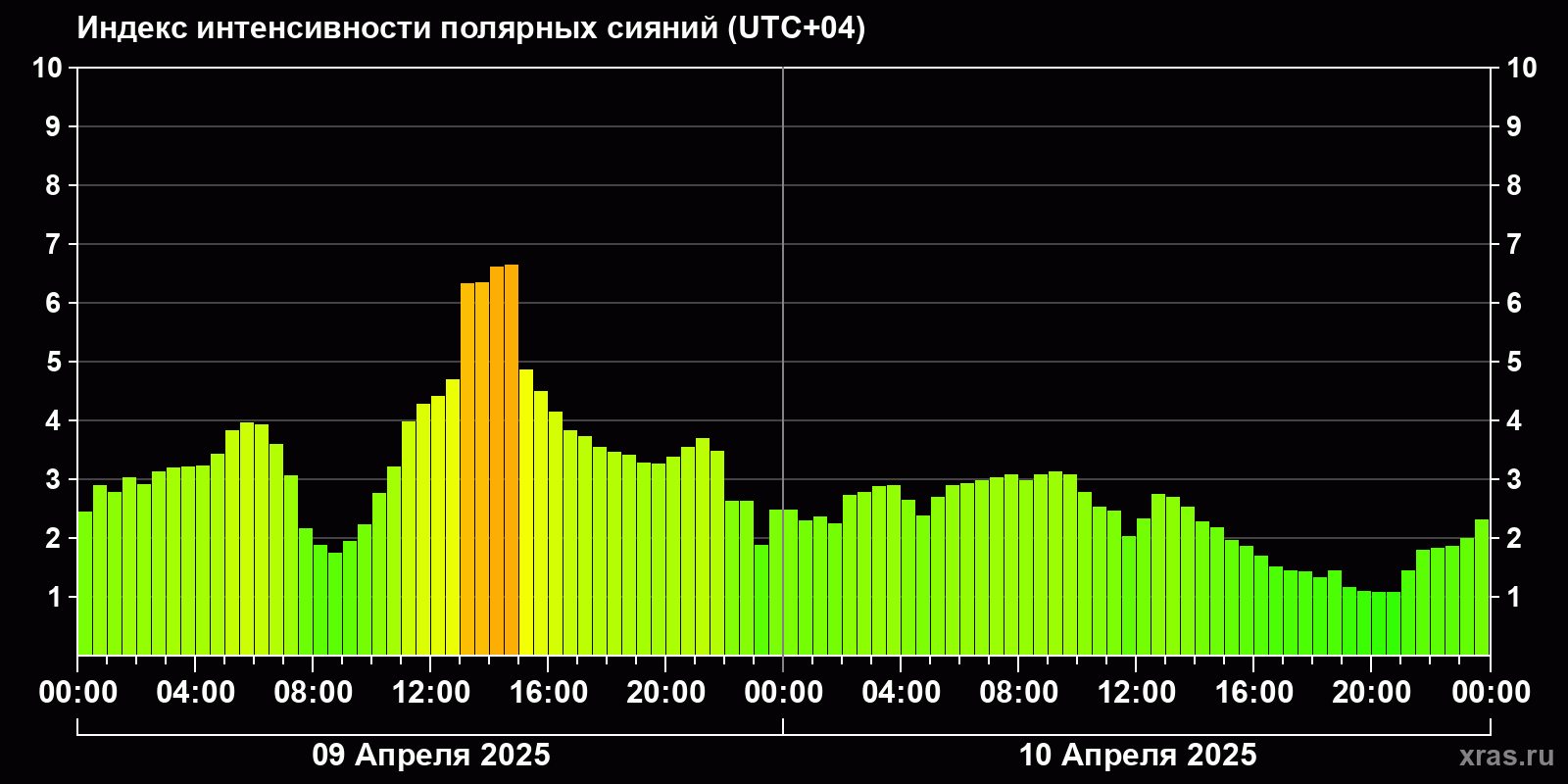 Изменения индекса интенсивности полярных сияний с 2025-04-09 по 2025-04-10 по местному времени