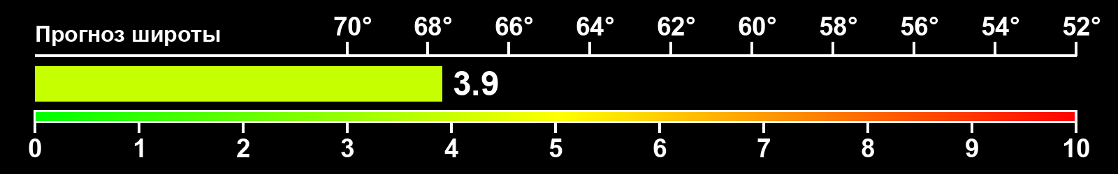 Индекс интенсивности полярных сияний и теоретически возможная широта наблюдений для ночного времени в восточном полушарии по состоянию на 2026-02-11 23:51 (конец дня) по местному времени