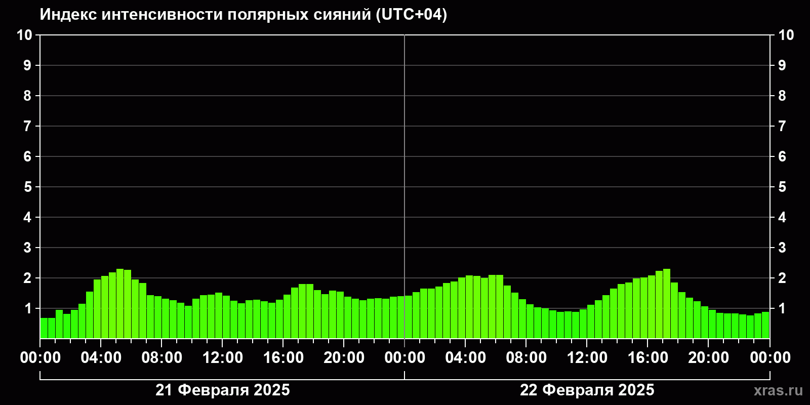 Изменения индекса интенсивности полярных сияний с 2025-02-21 по 2025-02-22 по местному времени
