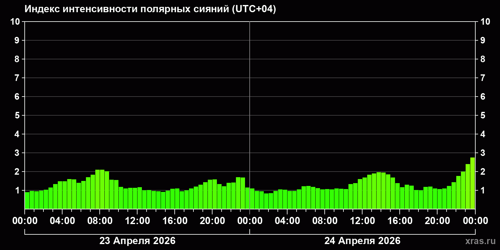 Изменения индекса интенсивности полярных сияний с 2026-04-23 по 2026-04-24 по местному времени