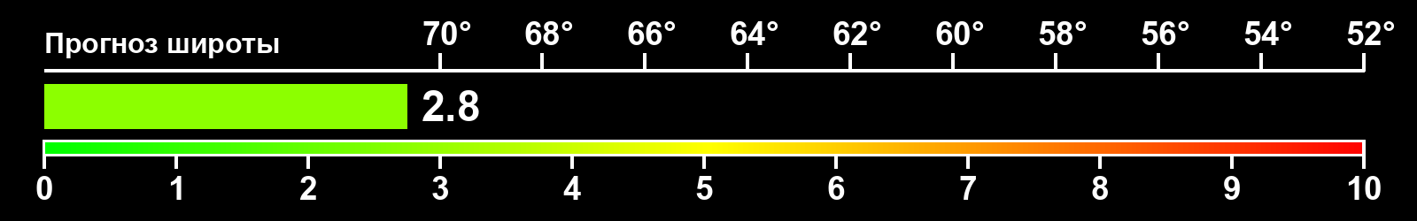 Индекс интенсивности полярных сияний и теоретически возможная широта наблюдений для ночного времени в восточном полушарии по состоянию на 2026-04-24 23:51 (конец дня) по местному времени