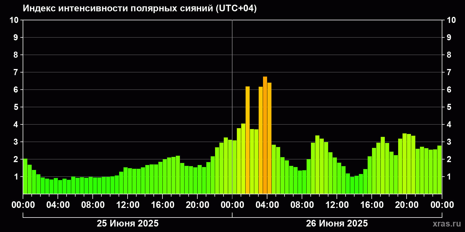Изменения индекса интенсивности полярных сияний с 2025-06-25 по 2025-06-26 по местному времени