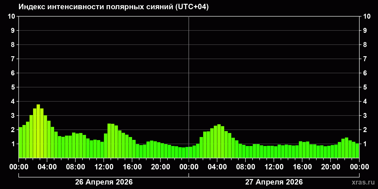 Изменения индекса интенсивности полярных сияний с 2026-04-26 по 2026-04-27 по местному времени