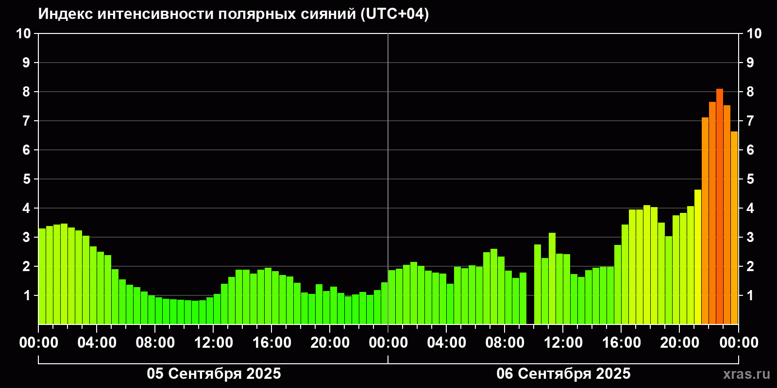 Изменения индекса интенсивности полярных сияний с 2025-09-05 по 2025-09-06 по местному времени