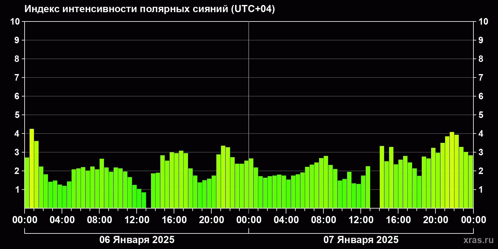 Изменения индекса интенсивности полярных сияний с 2025-01-06 по 2025-01-07 по местному времени
