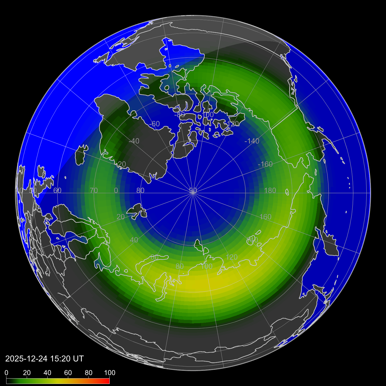 Изменения и часовой прогноз индекса интенсивности полярных сияний с 2025-12-23 по 2025-12-24