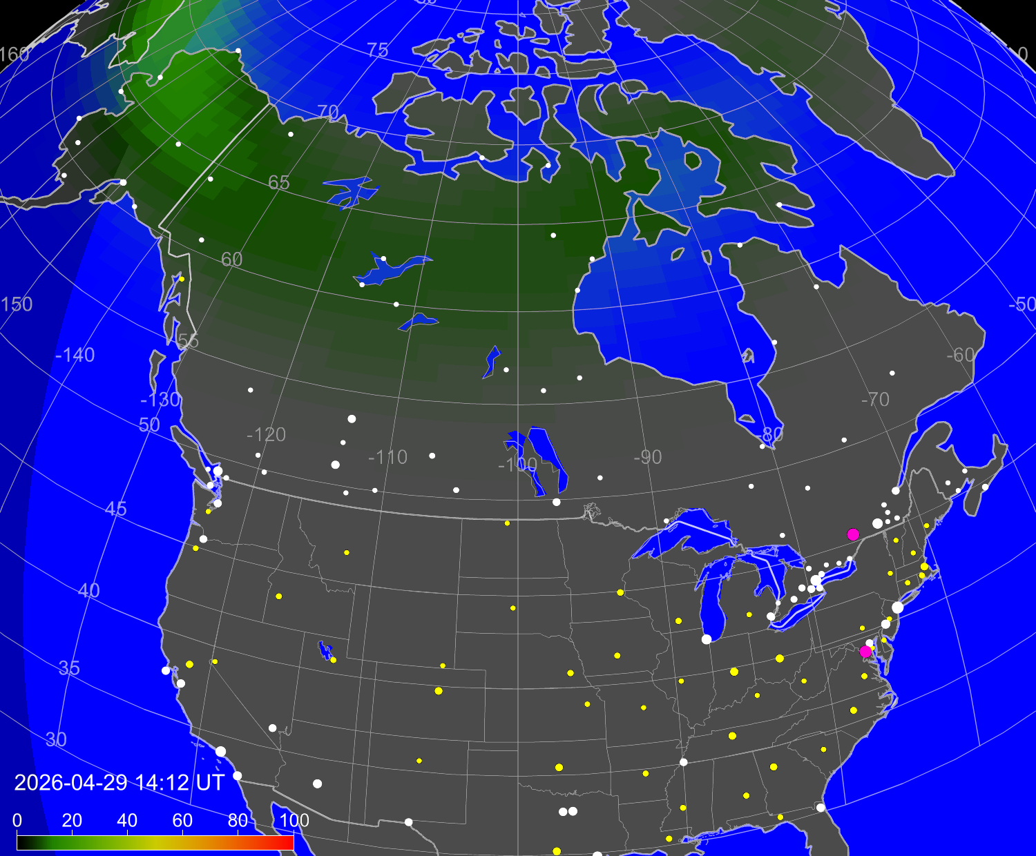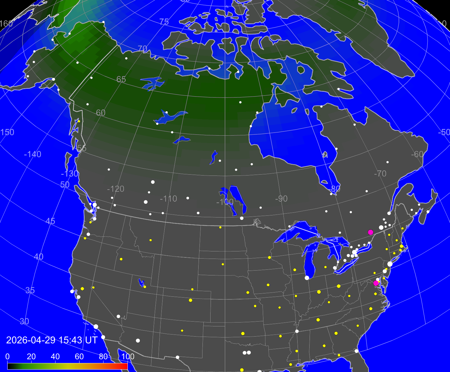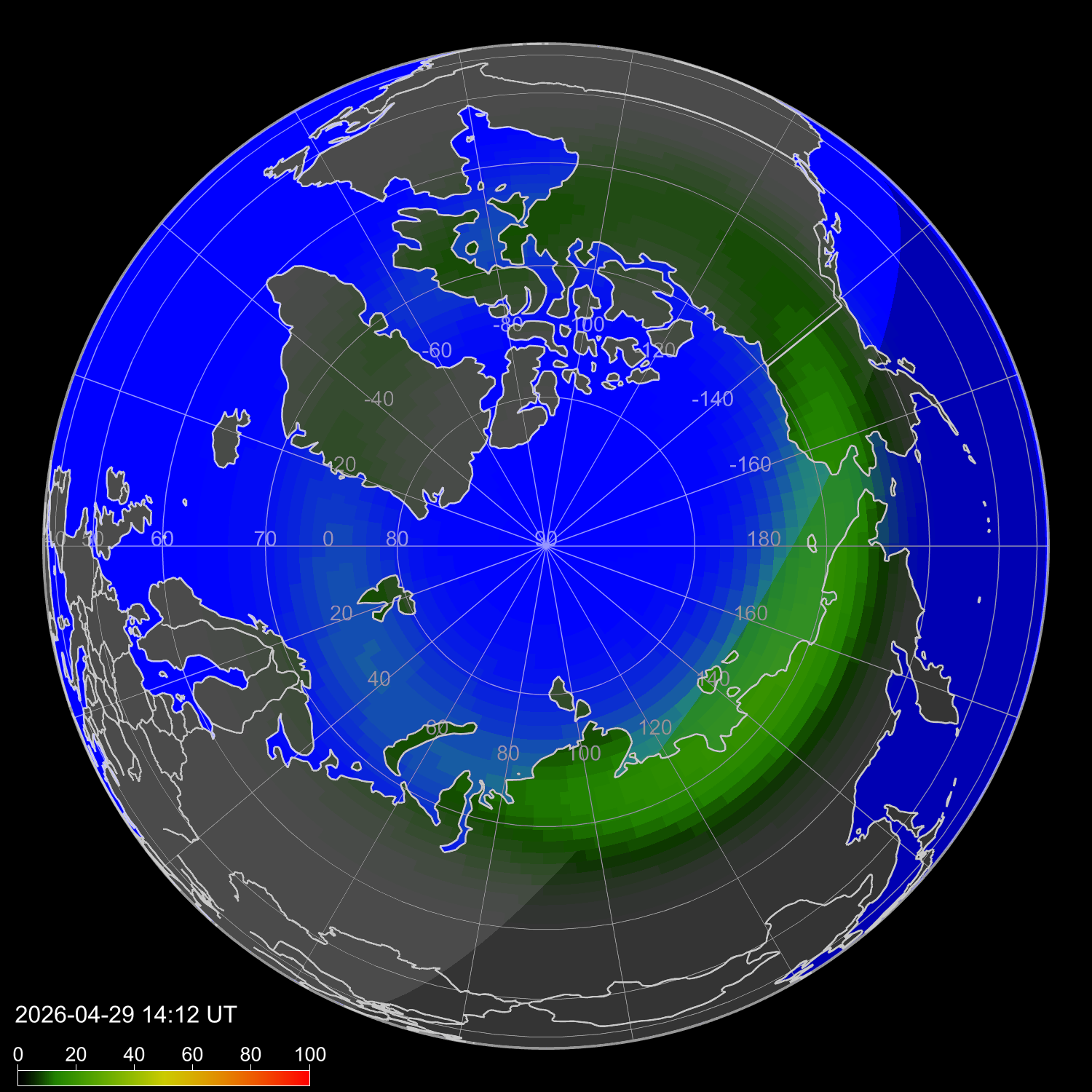 Индекс интенсивности полярных сияний и теоретически возможная широта наблюдений для ночного времени в западном полушарии