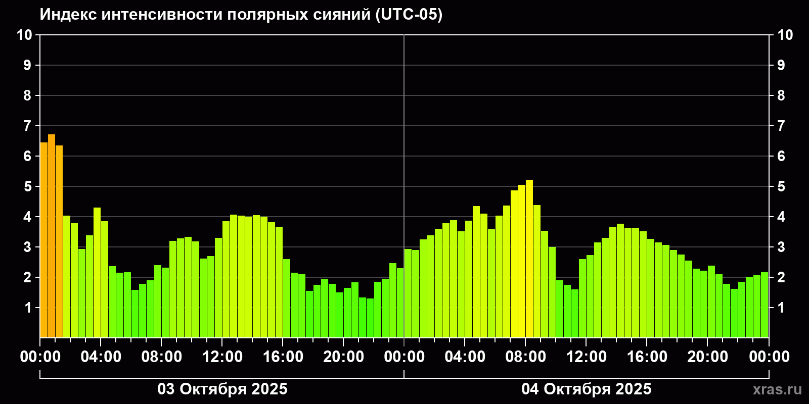 Изменения индекса интенсивности полярных сияний с 2025-10-03 по 2025-10-04 по местному времени