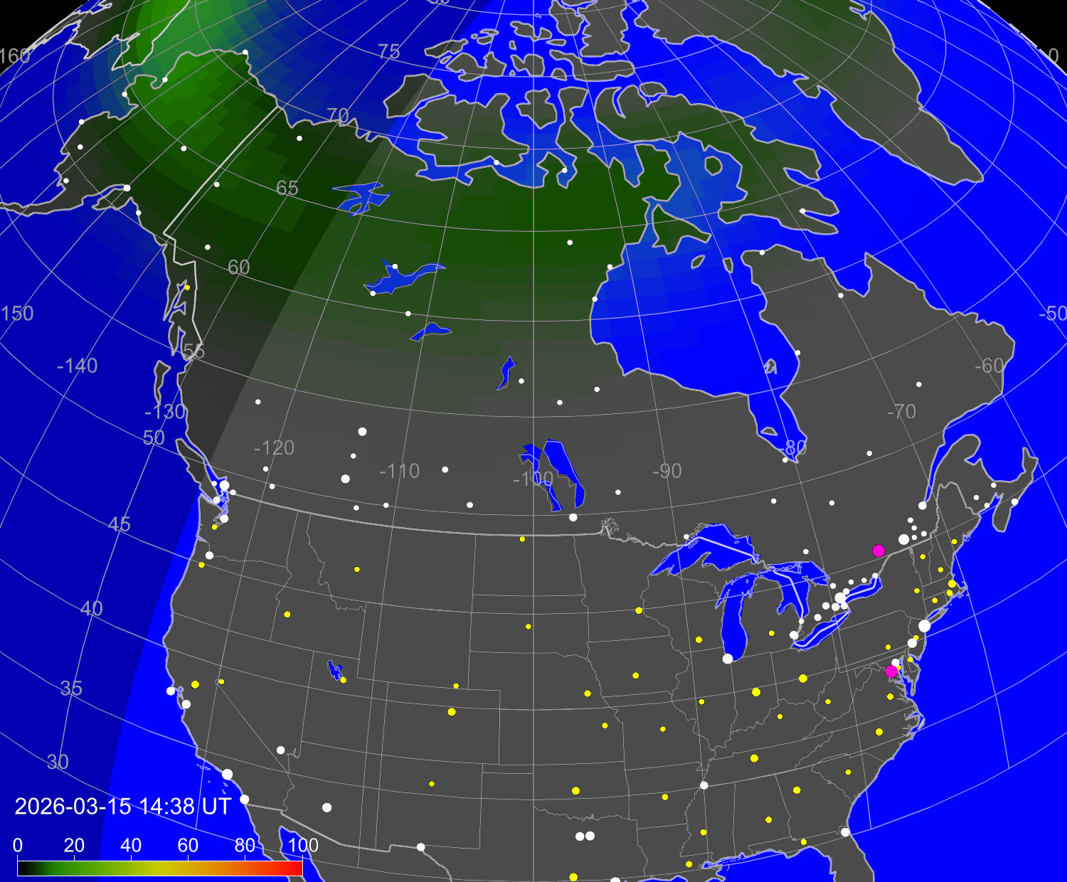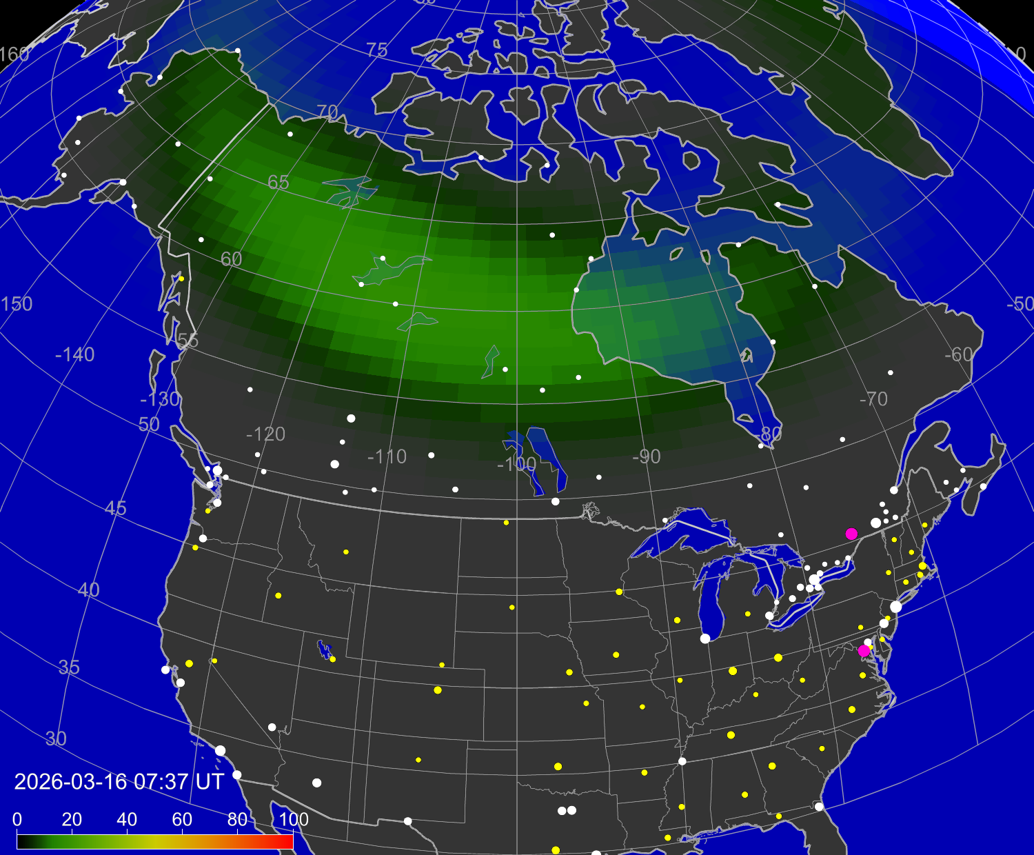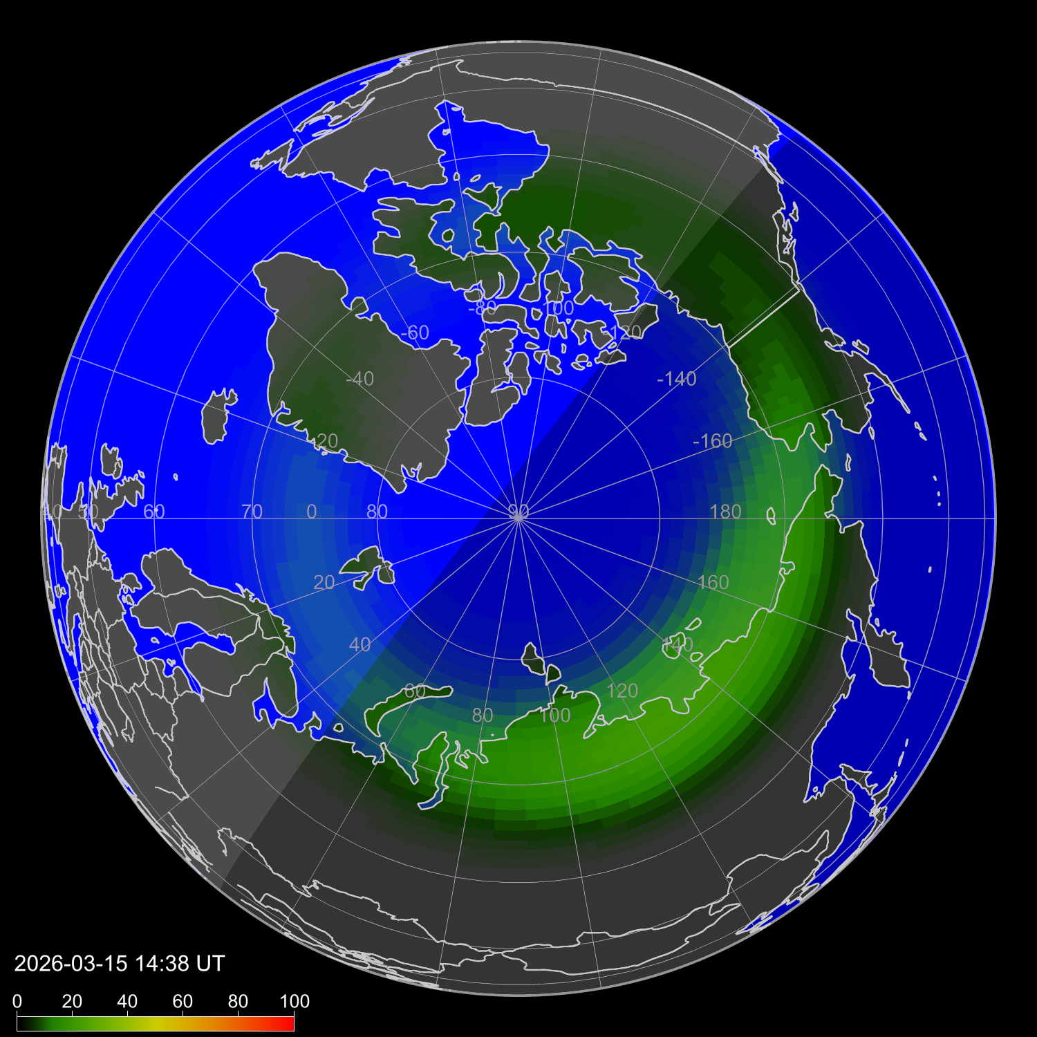 Изменения и часовой прогноз индекса интенсивности полярных сияний с 2026-03-14 по 2026-03-15