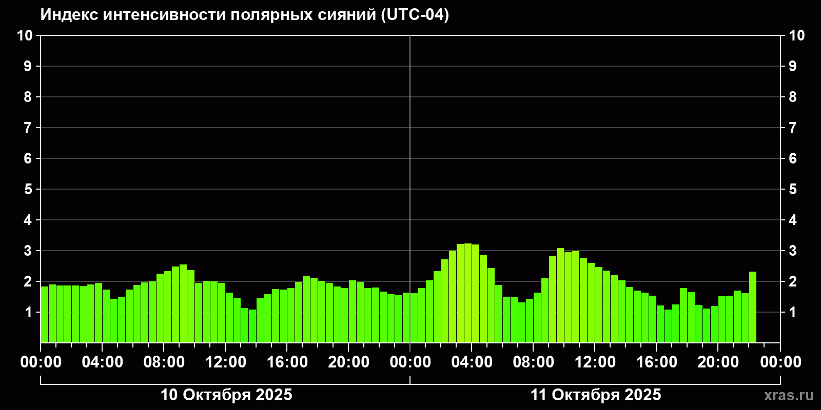 Изменения индекса интенсивности полярных сияний с 2025-10-10 по 2025-10-11 по местному времени
