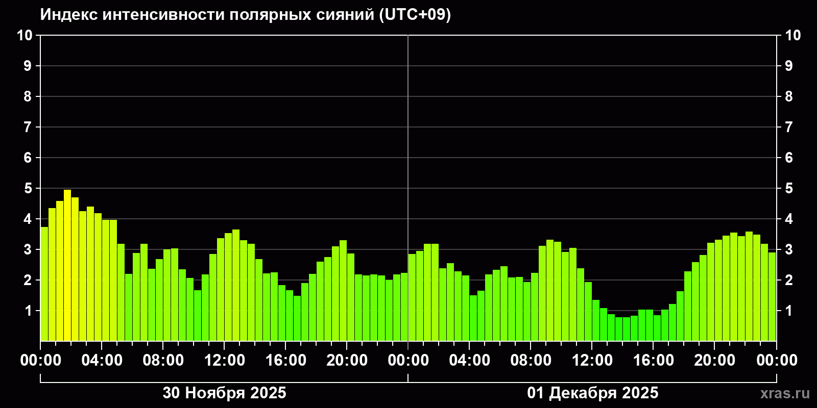 Изменения индекса интенсивности полярных сияний с 2025-11-30 по 2025-12-01 по местному времени