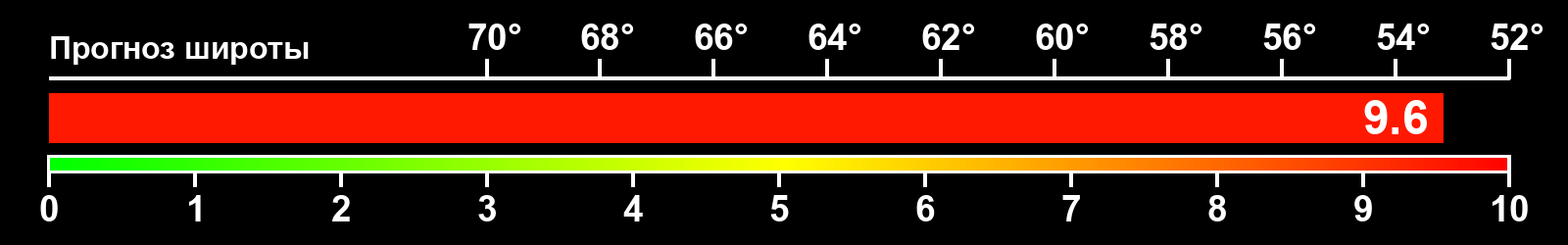 Индекс интенсивности полярных сияний и теоретически возможная широта наблюдений для ночного времени в восточном полушарии по состоянию на 2026-01-11 23:51 (конец дня) по местному времени