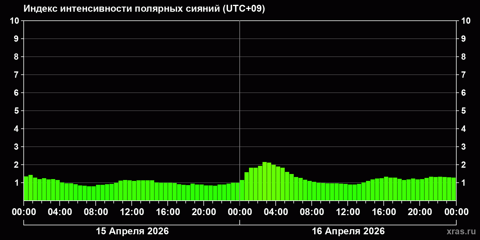 Изменения индекса интенсивности полярных сияний с 2026-04-15 по 2026-04-16 по местному времени
