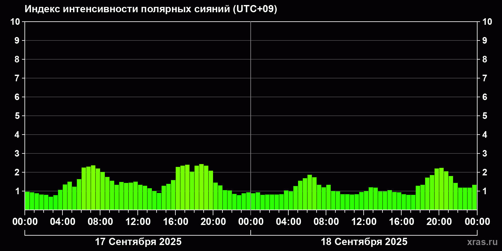 Изменения индекса интенсивности полярных сияний с 2025-09-17 по 2025-09-18 по местному времени