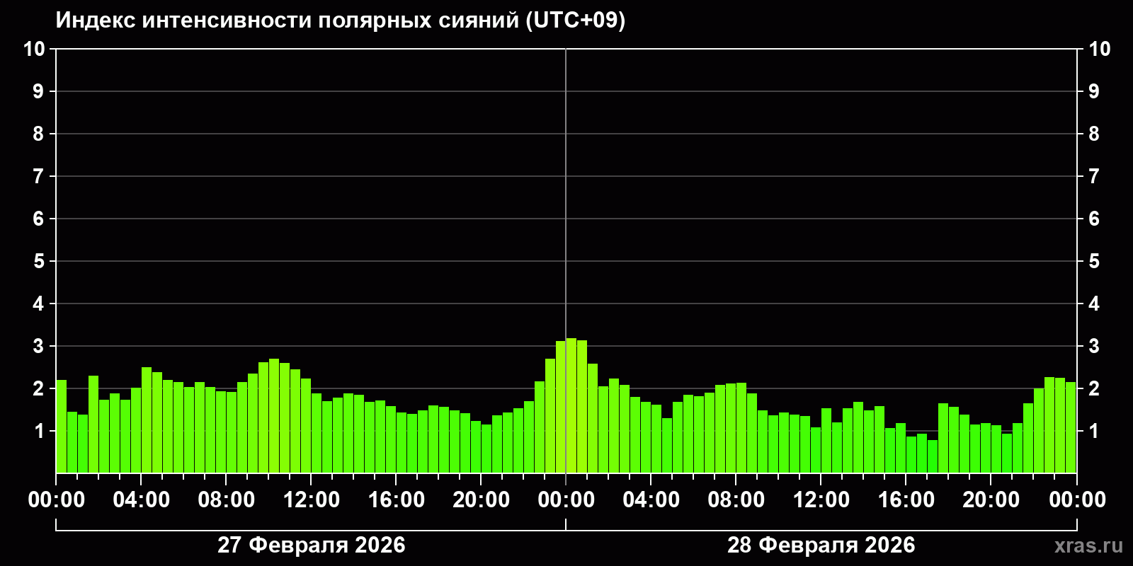 Изменения индекса интенсивности полярных сияний с 2026-02-27 по 2026-02-28 по местному времени