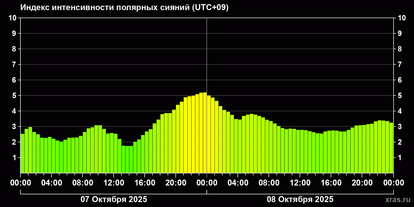 Изменения индекса интенсивности полярных сияний с 2025-10-07 по 2025-10-08 по местному времени
