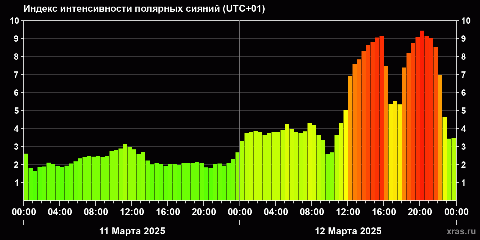 Изменения индекса интенсивности полярных сияний с 2025-03-11 по 2025-03-12 по местному времени