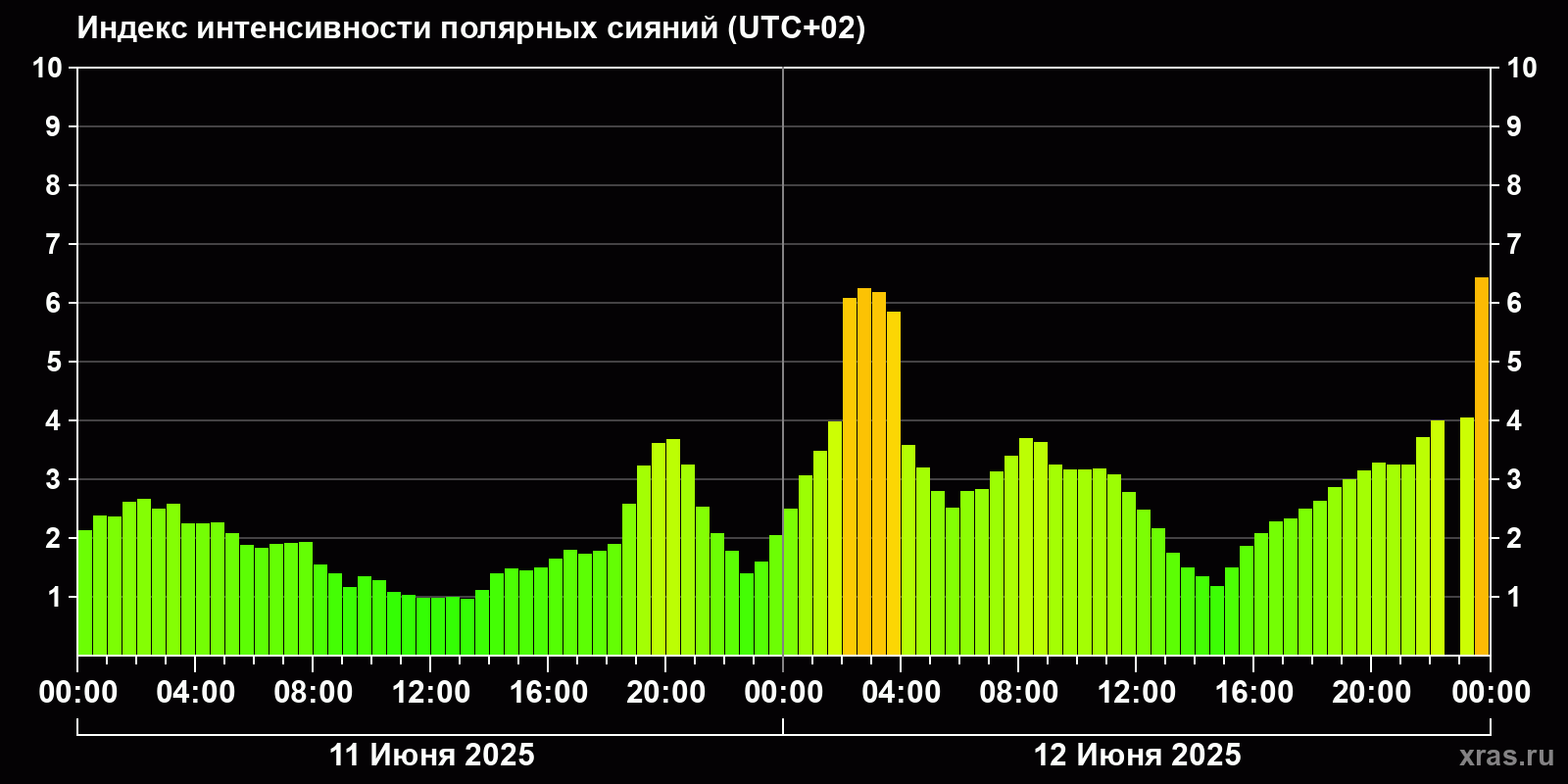 Изменения индекса интенсивности полярных сияний с 2025-06-11 по 2025-06-12 по местному времени