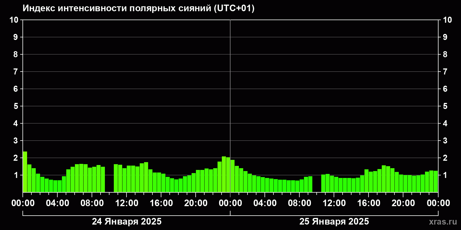 Изменения индекса интенсивности полярных сияний с 2025-01-24 по 2025-01-25 по местному времени