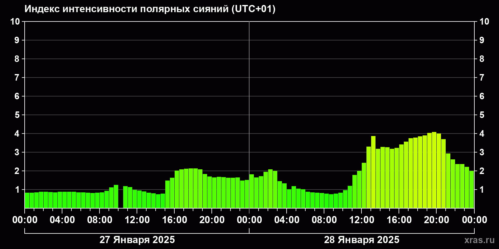 Изменения индекса интенсивности полярных сияний с 2025-01-27 по 2025-01-28 по местному времени