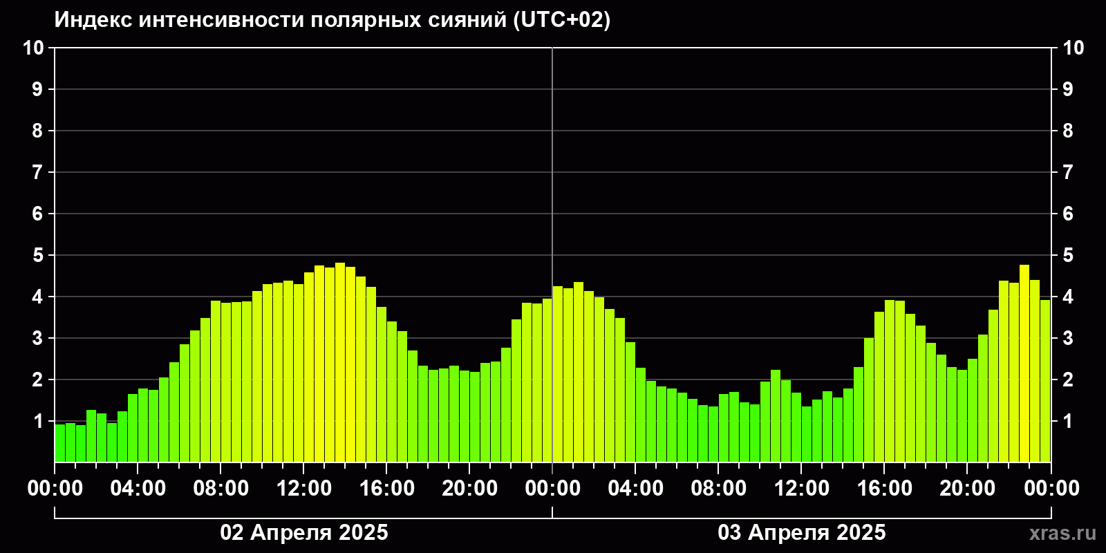Изменения индекса интенсивности полярных сияний с 2025-04-02 по 2025-04-03 по местному времени