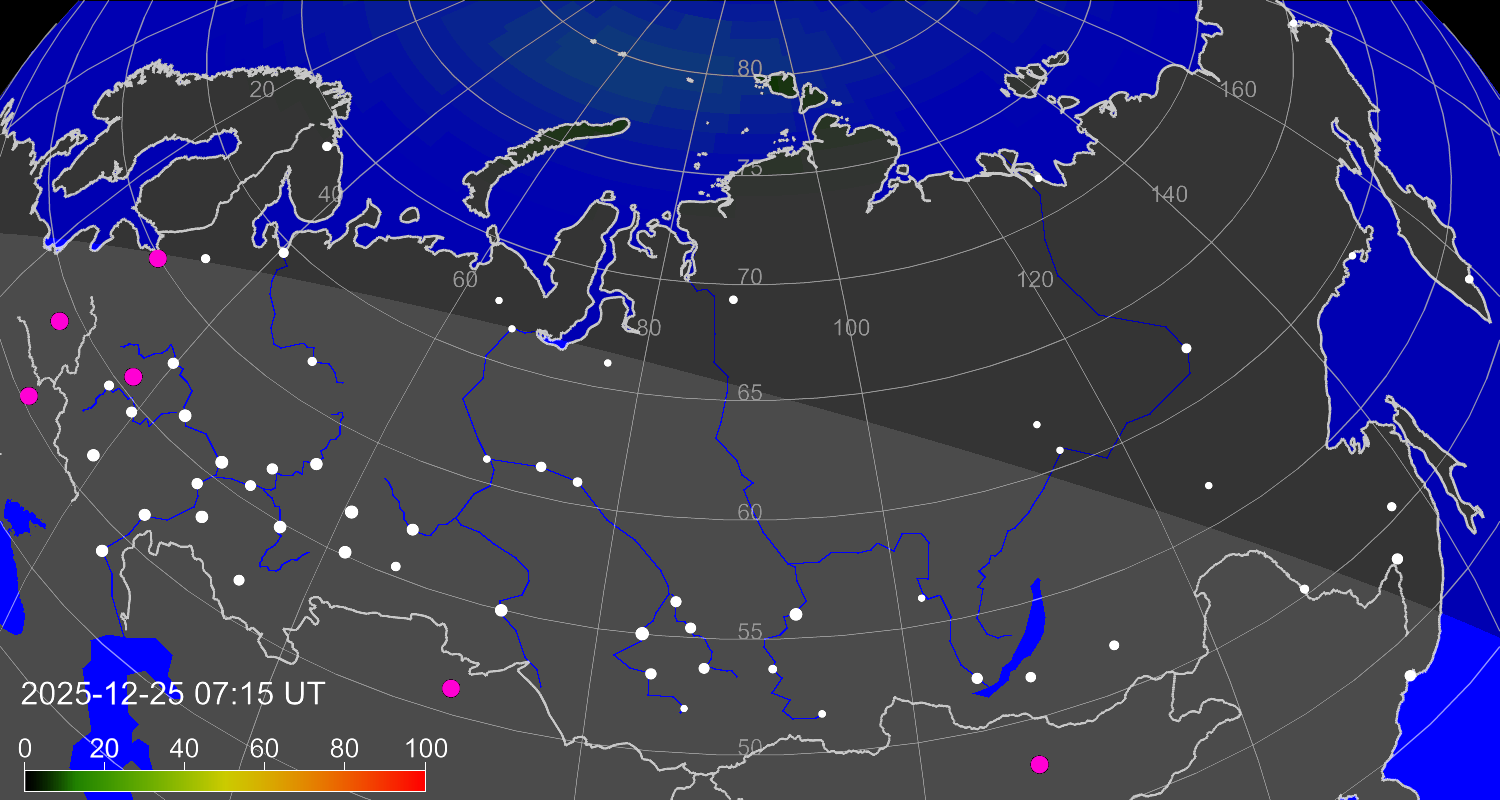 Индекс интенсивности полярных сияний и теоретически возможная широта наблюдений для ночного времени в восточном полушарии