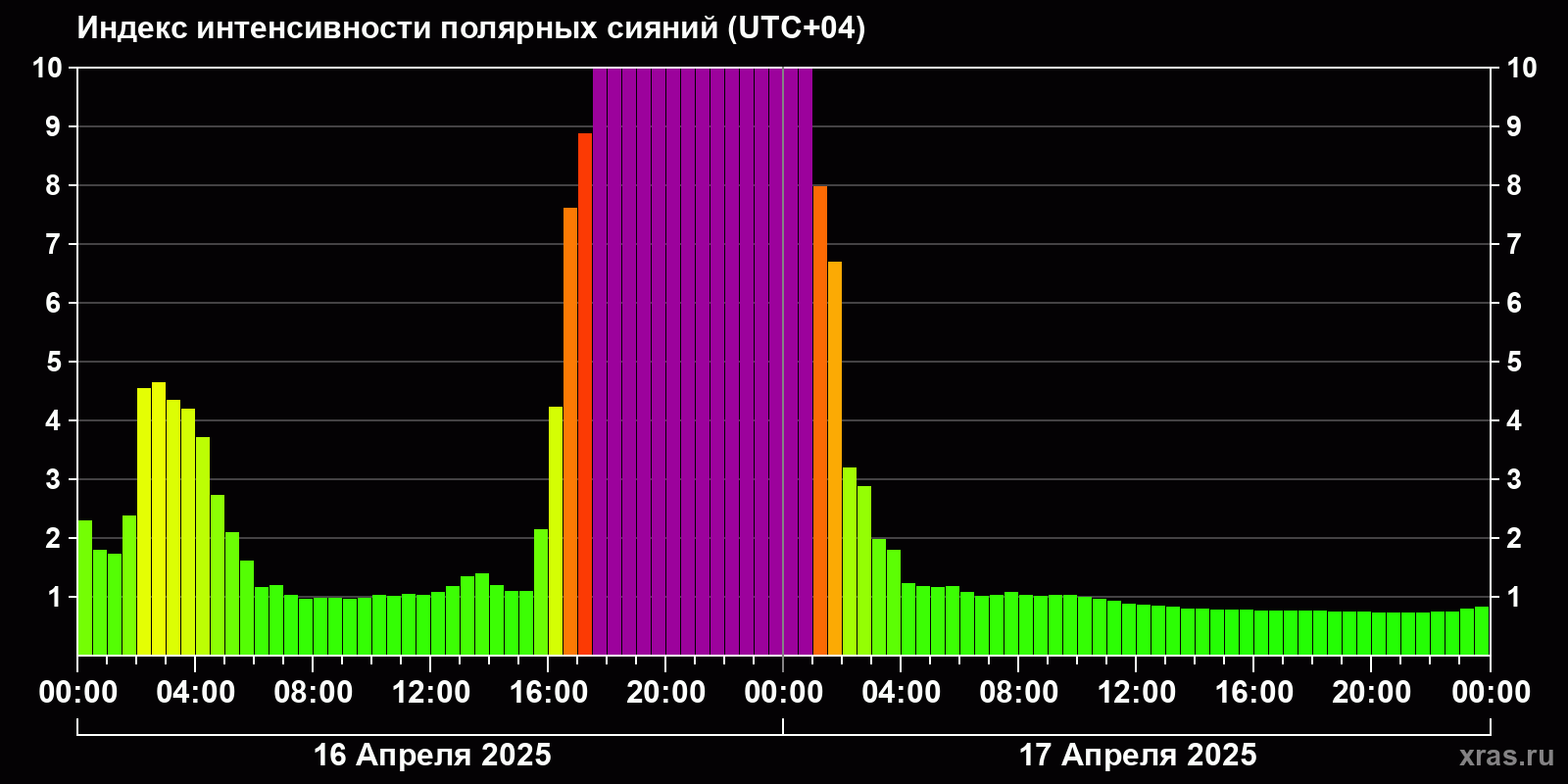 Изменения индекса интенсивности полярных сияний с 2025-04-16 по 2025-04-17 по местному времени
