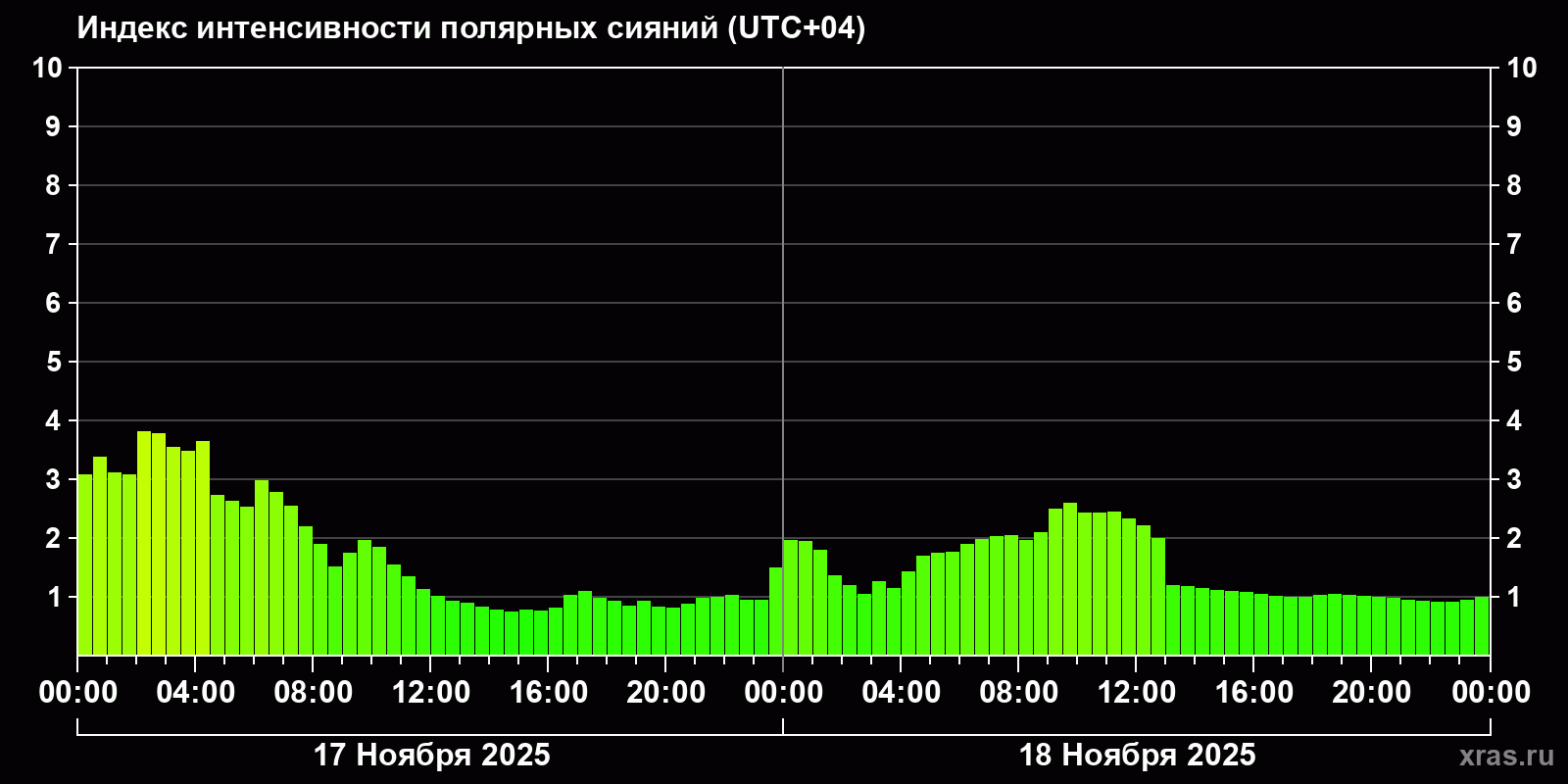 Изменения индекса интенсивности полярных сияний с 2025-11-17 по 2025-11-18 по местному времени