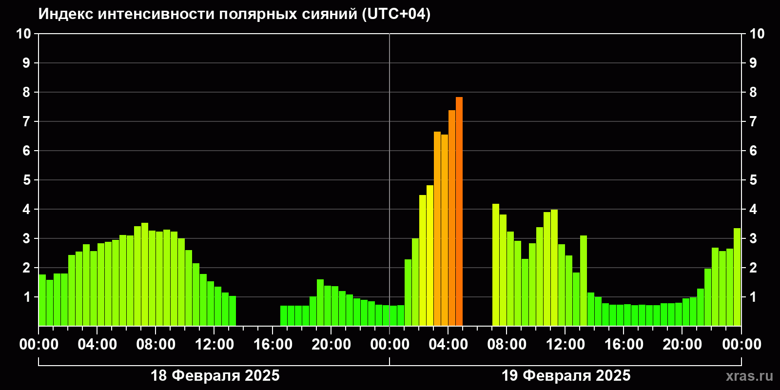 Изменения индекса интенсивности полярных сияний с 2025-02-18 по 2025-02-19 по местному времени