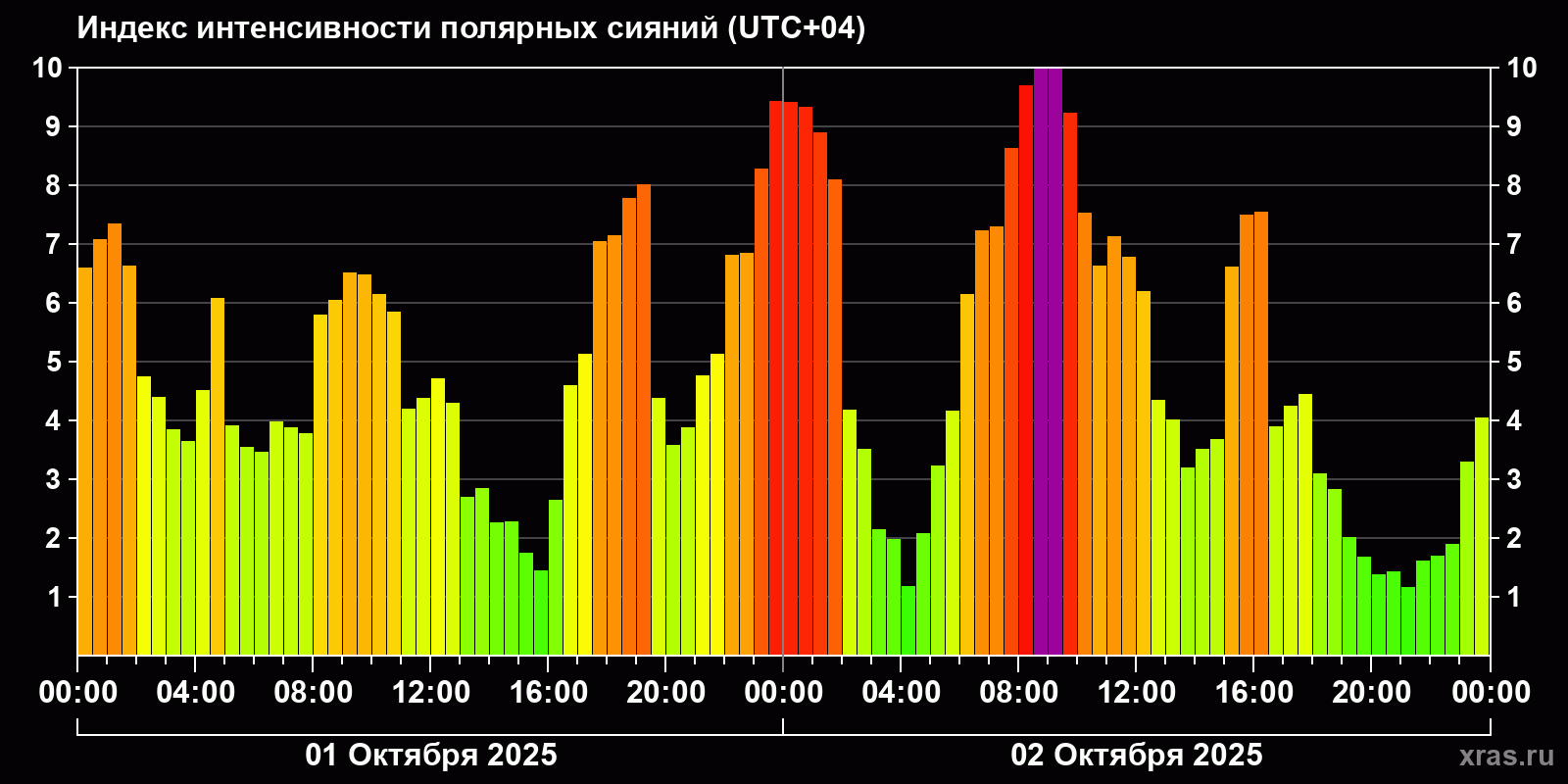 Изменения индекса интенсивности полярных сияний с 2025-10-01 по 2025-10-02 по местному времени