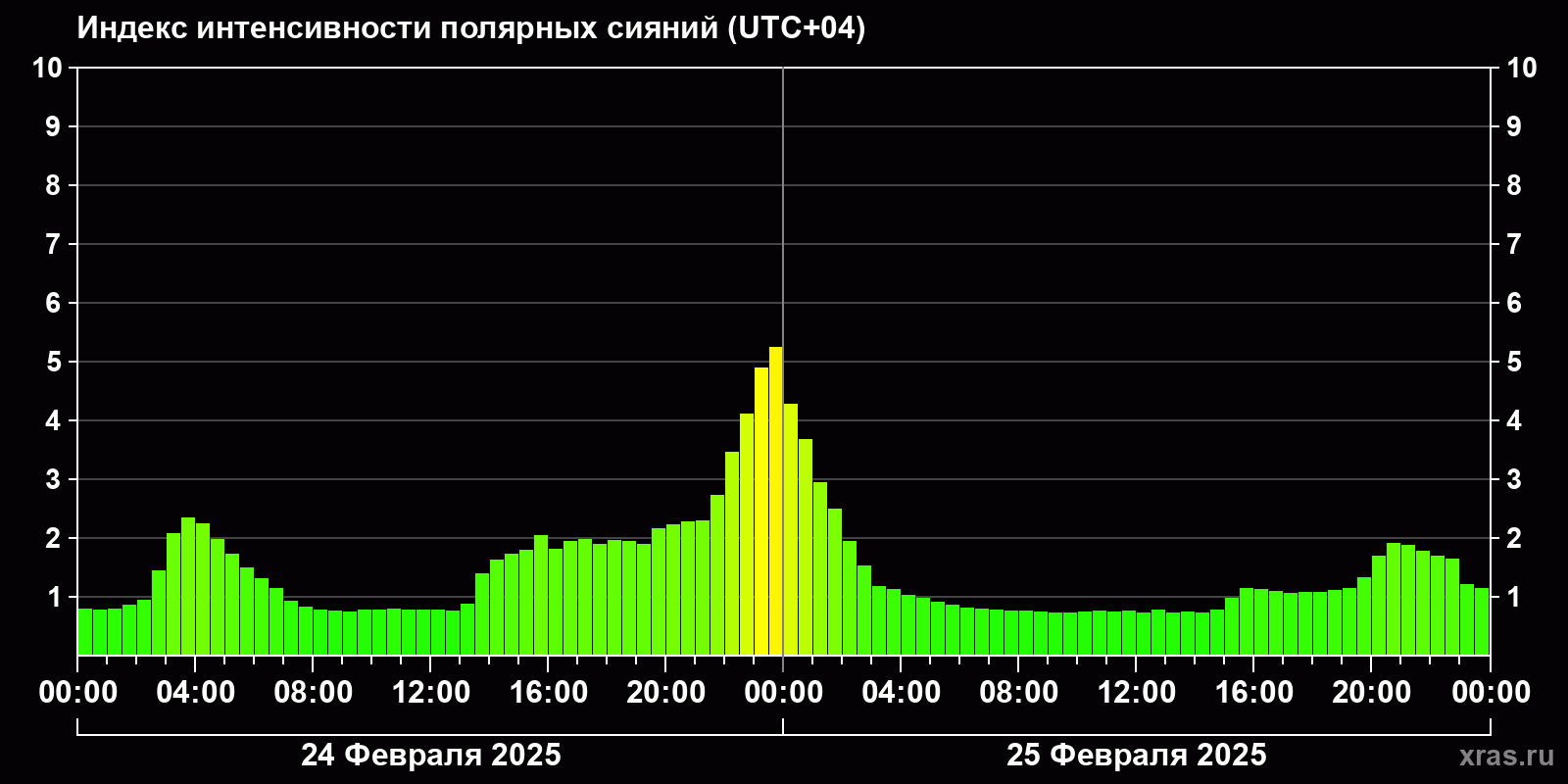 Изменения индекса интенсивности полярных сияний с 2025-02-24 по 2025-02-25 по местному времени