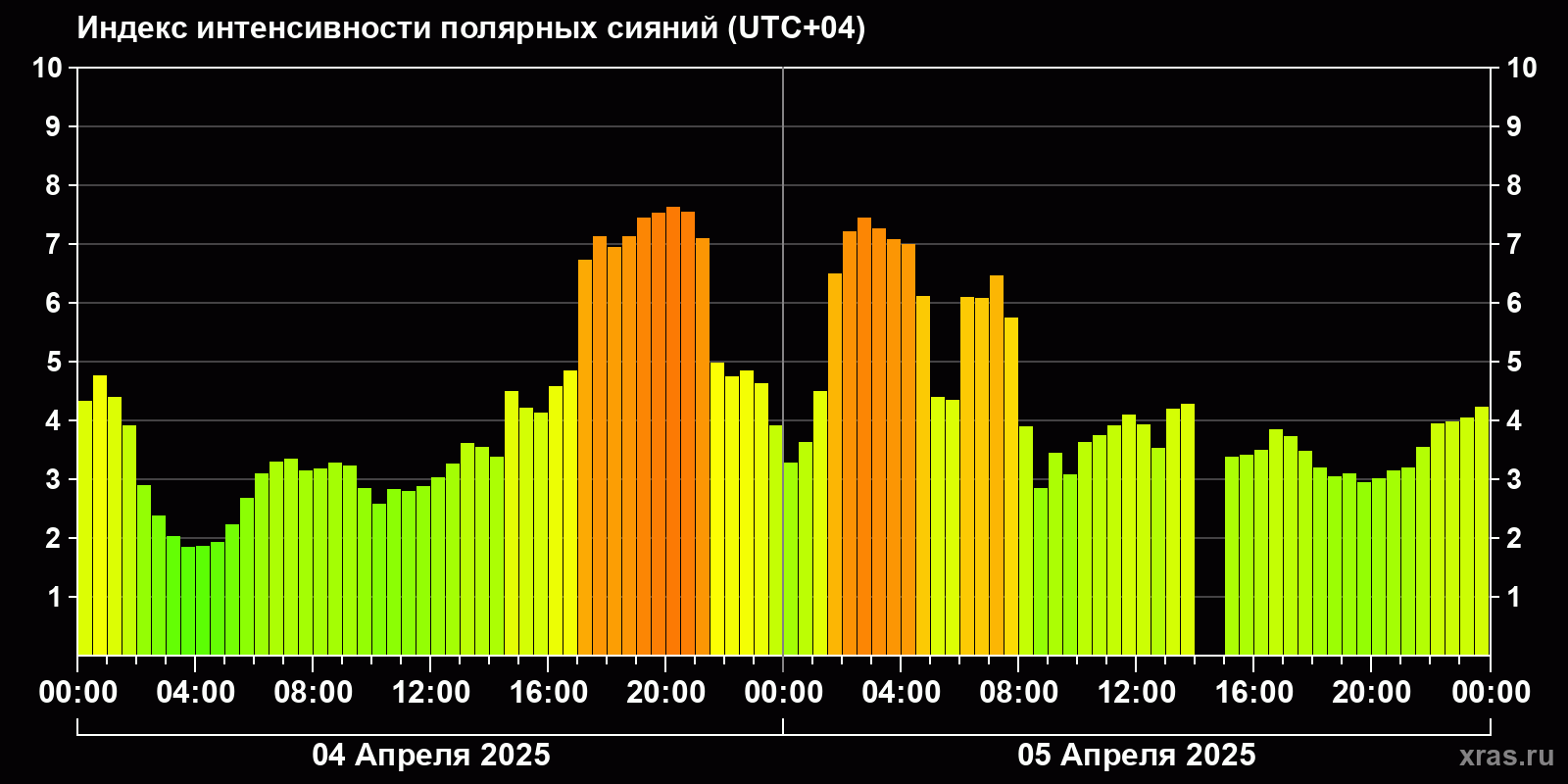 Изменения индекса интенсивности полярных сияний с 2025-04-04 по 2025-04-05 по местному времени