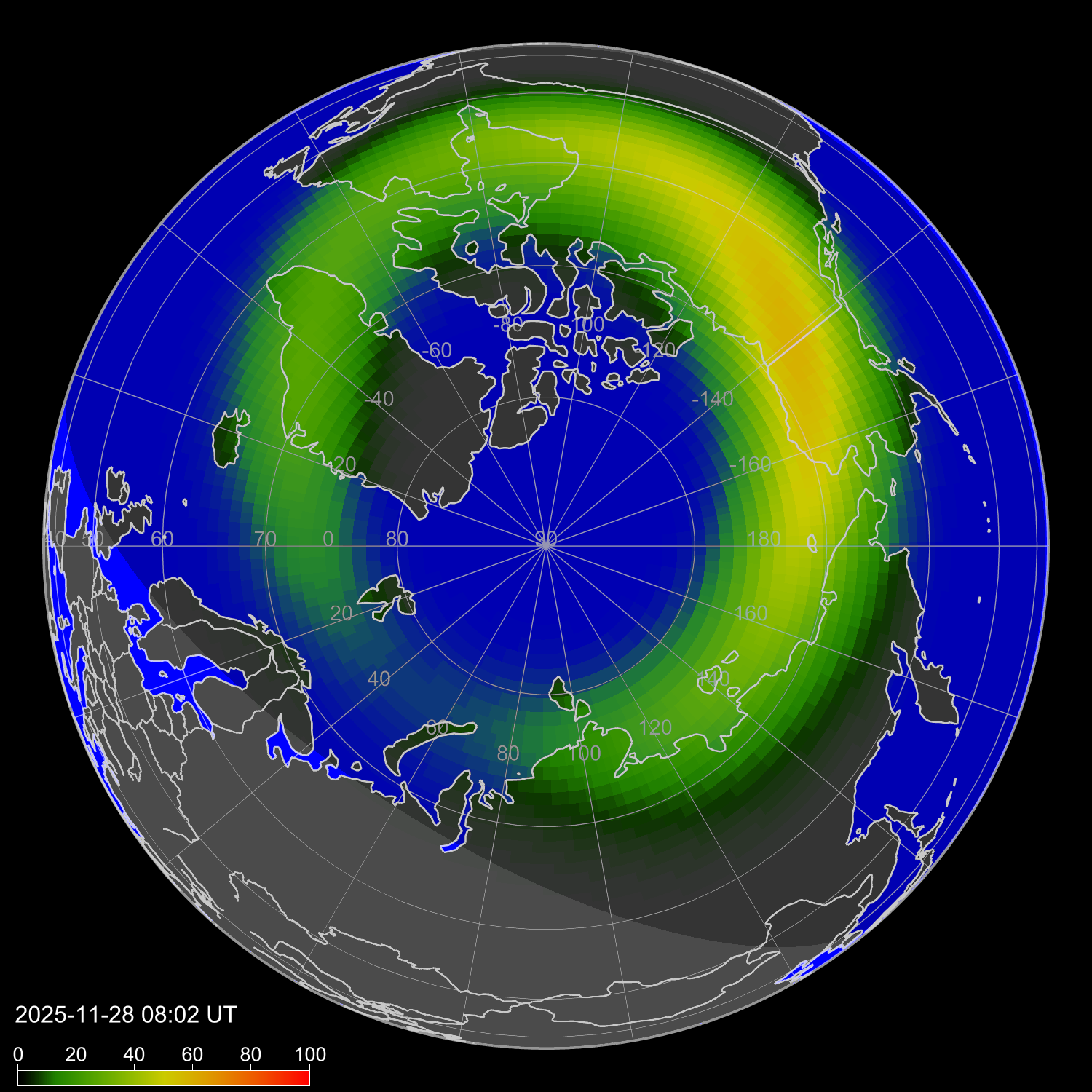 Изменения и часовой прогноз индекса интенсивности полярных сияний с 2025-11-27 по 2025-11-28