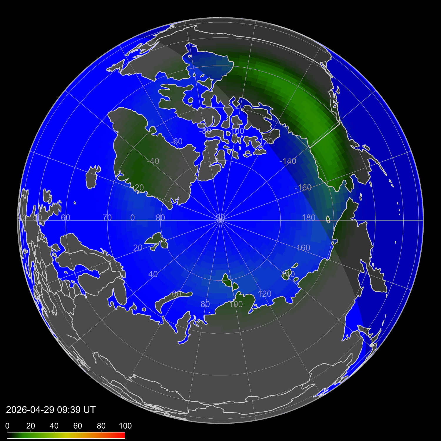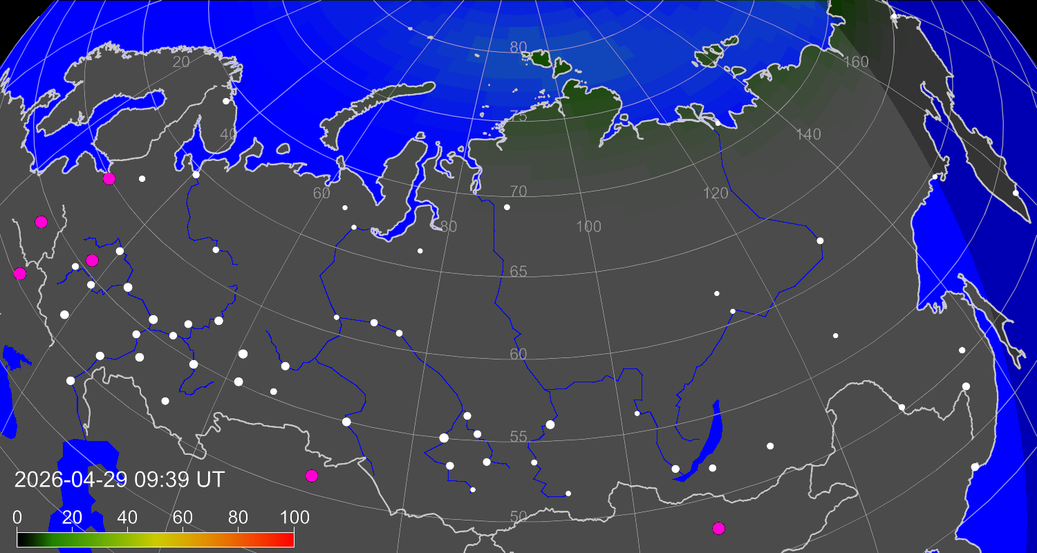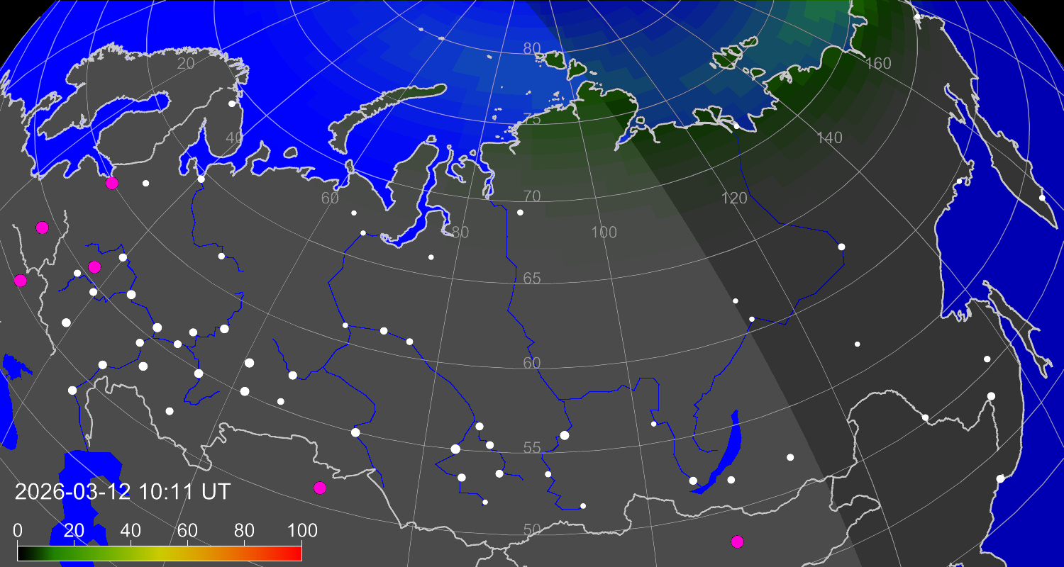 Индекс интенсивности полярных сияний и теоретически возможная широта наблюдений для ночного времени в восточном полушарии