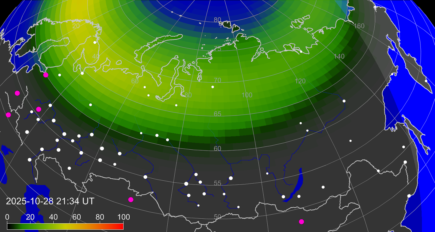Вероятность полярных сияний в городах Российской Федерации